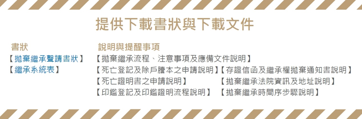 【拋棄繼承聲請書狀】、【繼承系統表】、【聲請拋棄繼承流程、注意事項及應備文件說明】、【死亡登記及除戶謄本之申請說明】、【死亡證明書之申請說明】、【印鑑登記及印鑑證明流程說明】、【存證信函及繼承權拋棄通知書說明】、【拋棄繼承法院資訊及地址說明】、【拋棄繼承時間序步驟說明】。